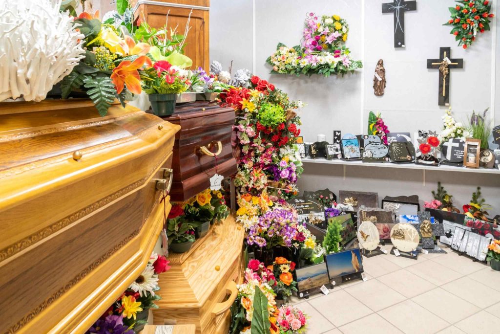 - – les articles : cercueil, capiton, urne, fleurs, plaques;